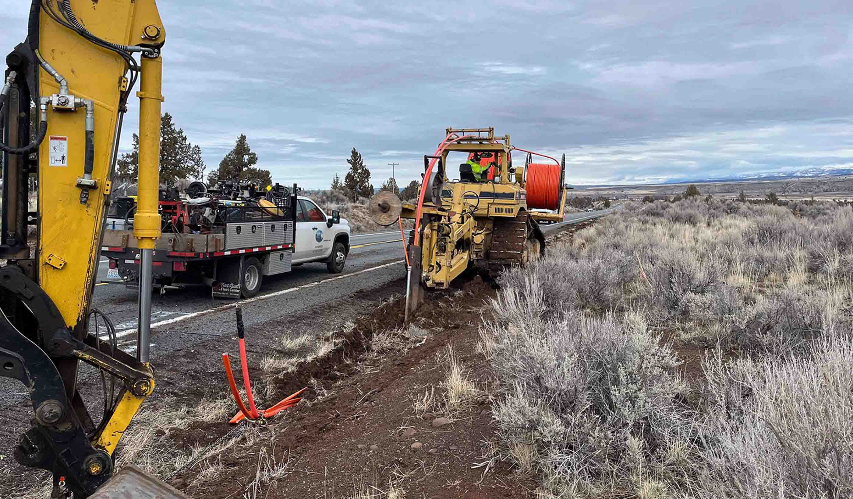 Construction crews running fiber optic cable along a hillside road. Sometimes, using an existing road corridor can help the easement process.