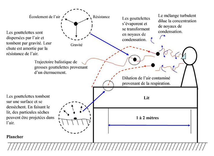 Les particules produites par la respiration, la toux, les éternuements ou lorsque nous parlons commencent à s’évaporer aussitôt qu’elles sont projetées dans l’air. Le taux d’évaporation dépend entièrement de l’humidité ambiante relative. À mesure que les gouttelettes s’évaporent, elles rapetissent jusqu’à devenir si petites qu’elles se mettent à flotter. Soulevées par les courants et la diffusion de l’air, elles se retrouvent en suspension dans l’air.