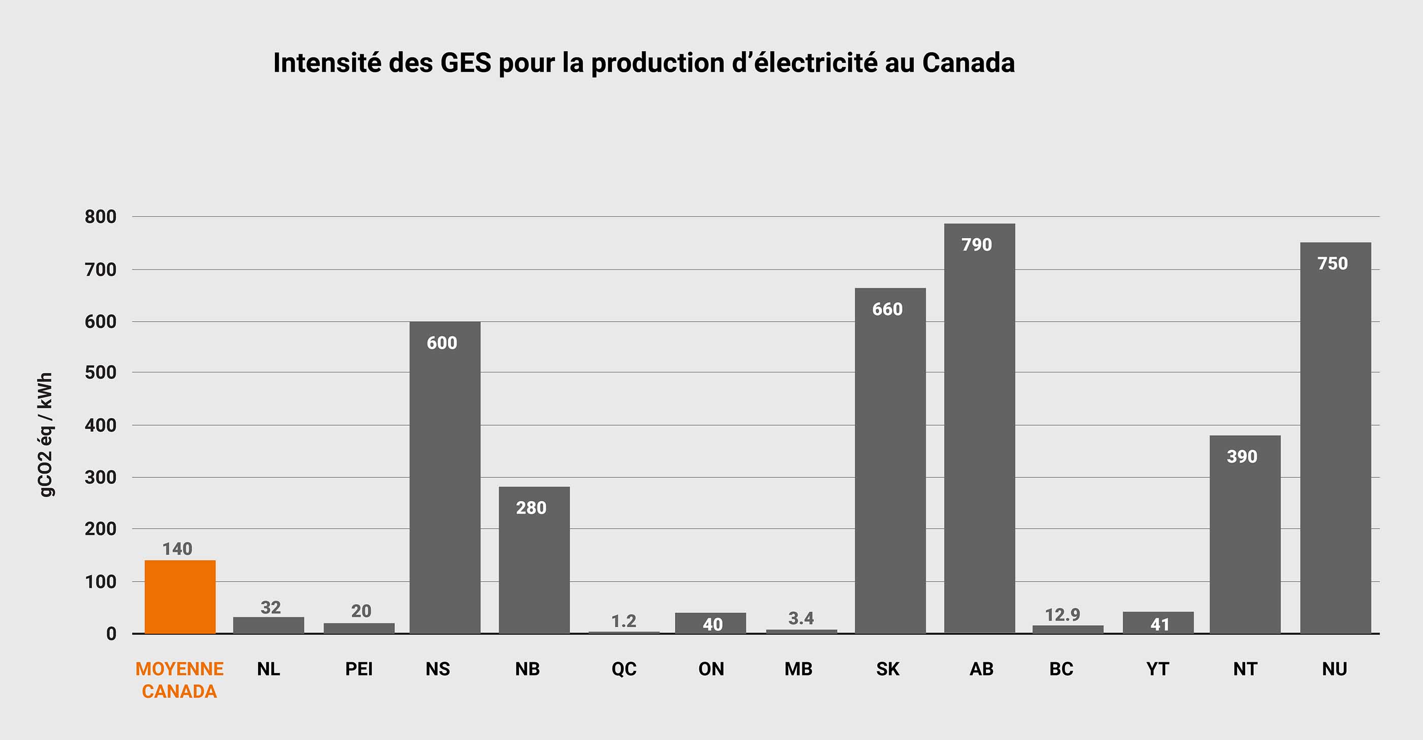 Ce graphique illustre l’intensité des émissions de GES pour la production d’électricité dans chaque province au Canada.