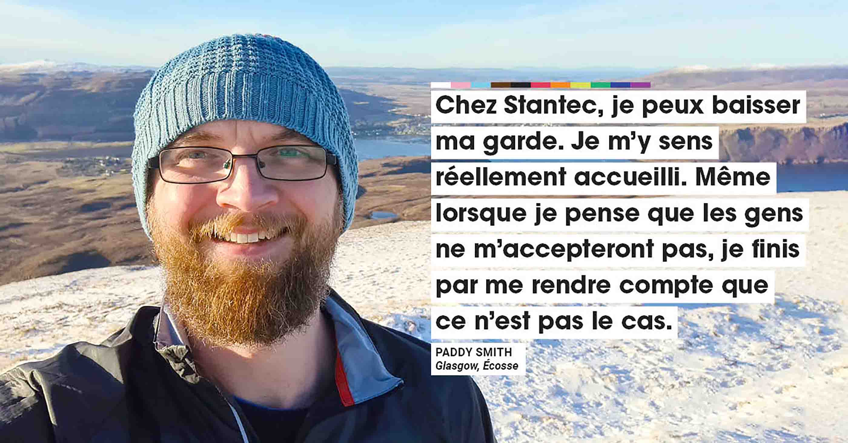 Chez Stantec, je peux baisser ma garde. Je m’y sens réellement accueilli. Même lorsque je pense que les gens ne m’accepteront pas, je finis par me rendre compte que ce n’est pas le cas. Beaucoup d’employés à tous les niveaux de notre entreprise ne sont pas des personnes LGBTQ+, mais sont tout de même des alliés de notre communauté. Le fait de pouvoir se sentir libre d’être soi-même au travail est essentiel. Un milieu de travail inclusif favorise la bonne humeur, améliore la productivité et entraîne des résultats positifs.